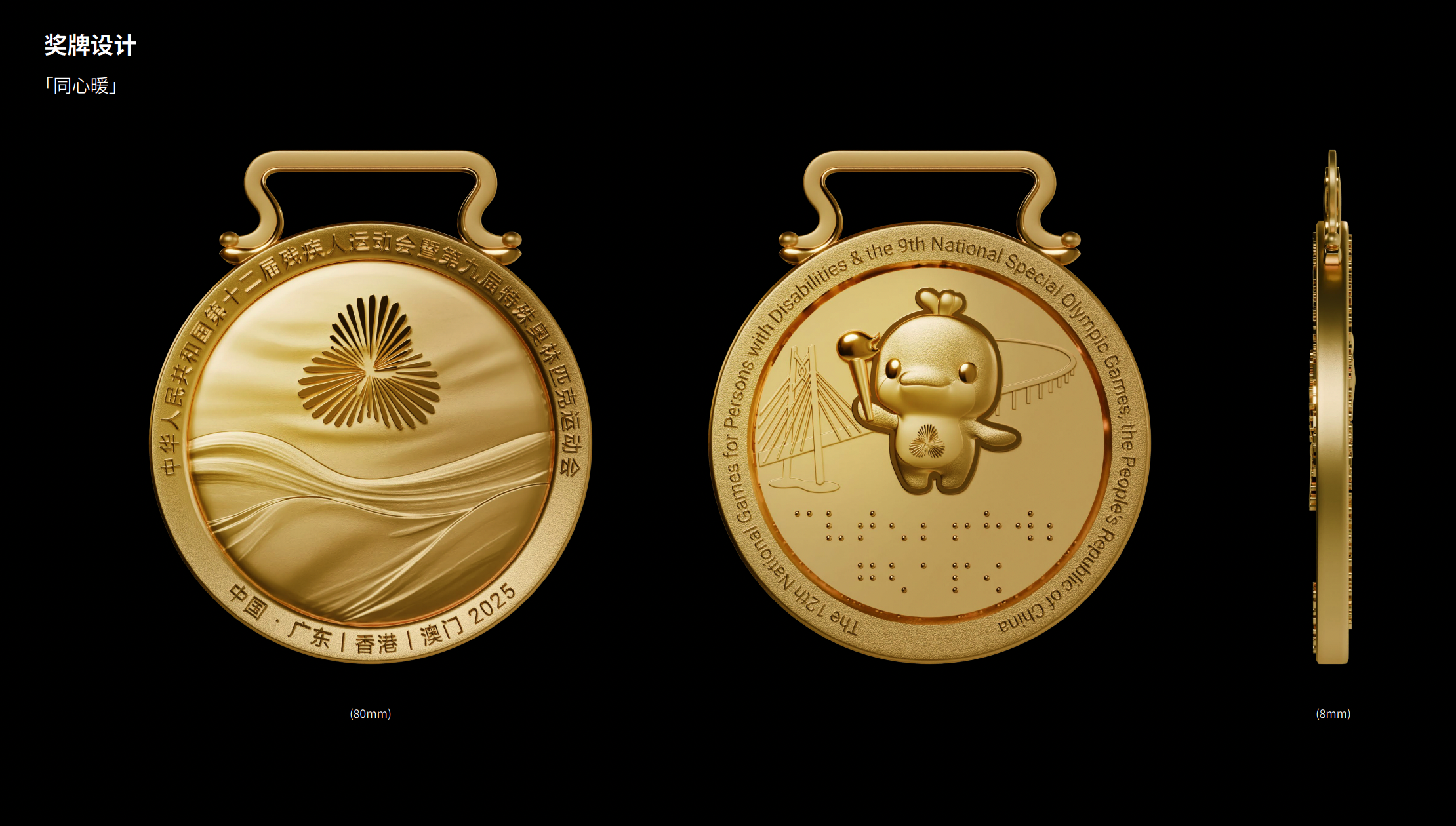奖牌正面精心镌刻的连绵海浪纹,象征着大海的广阔与包容,传递着残特奥会汇聚万众一心、众志成城的力量,更代表着运动员们破浪前行、永不言弃的意志与激情。奖牌设计融合传统与现代,一边是承载历史的岭南镬耳屋,一边是象征活力湾区的澎湃海浪,如同港珠澳大桥与岭南建筑跨越时空对话。